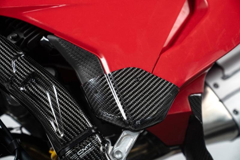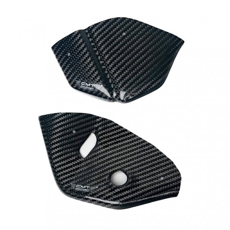 Protezioni adesivi tabelle posteriori realizzate in carbonio per i modelli DUCATI Desmo 450 MX 2025 - 2026 al fine di prevenire il celere deterioramento delle grafiche adesive e/o probabili rigature causate dallo sfregamento dello stivale a contatto con la parte iniziale della tabella.